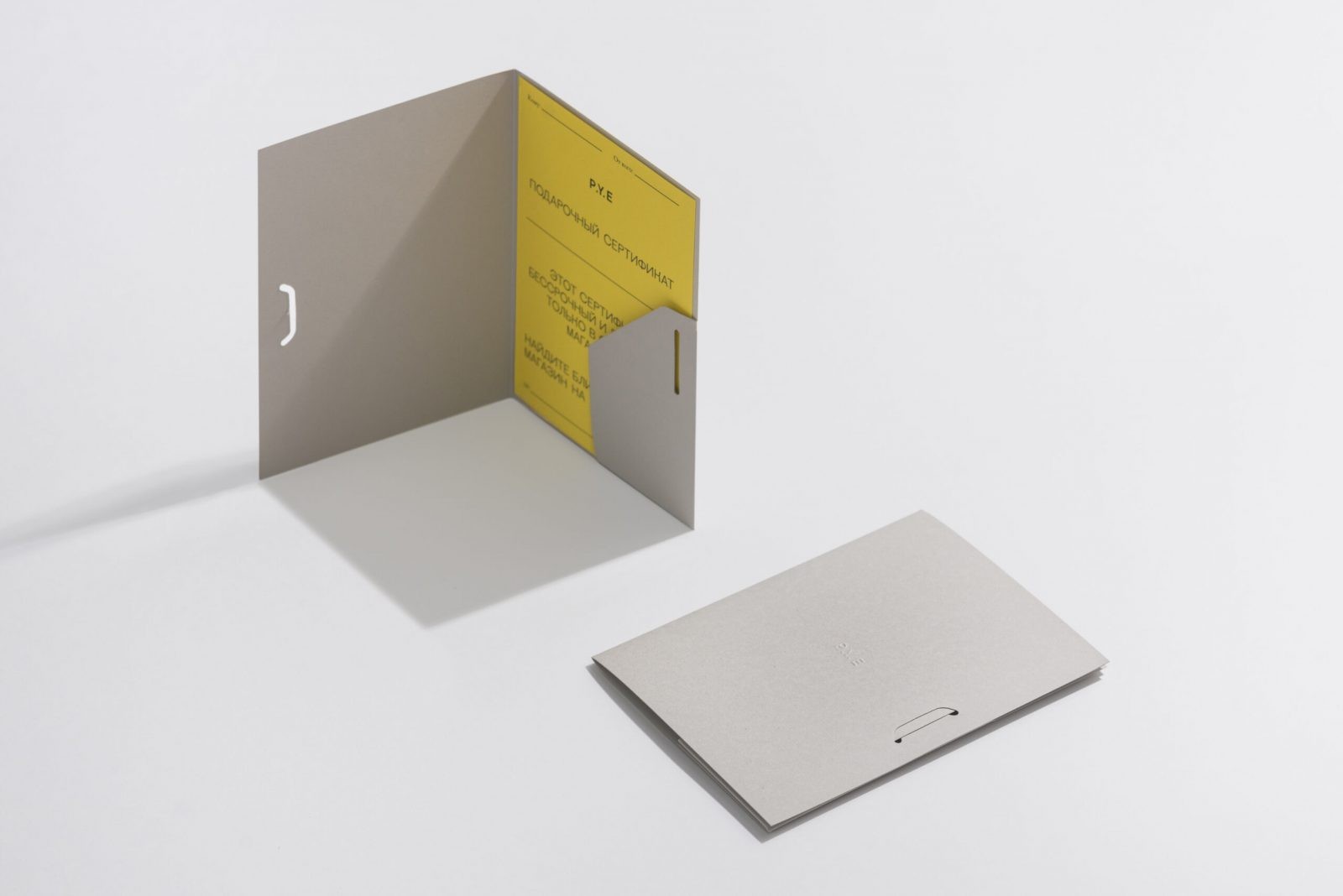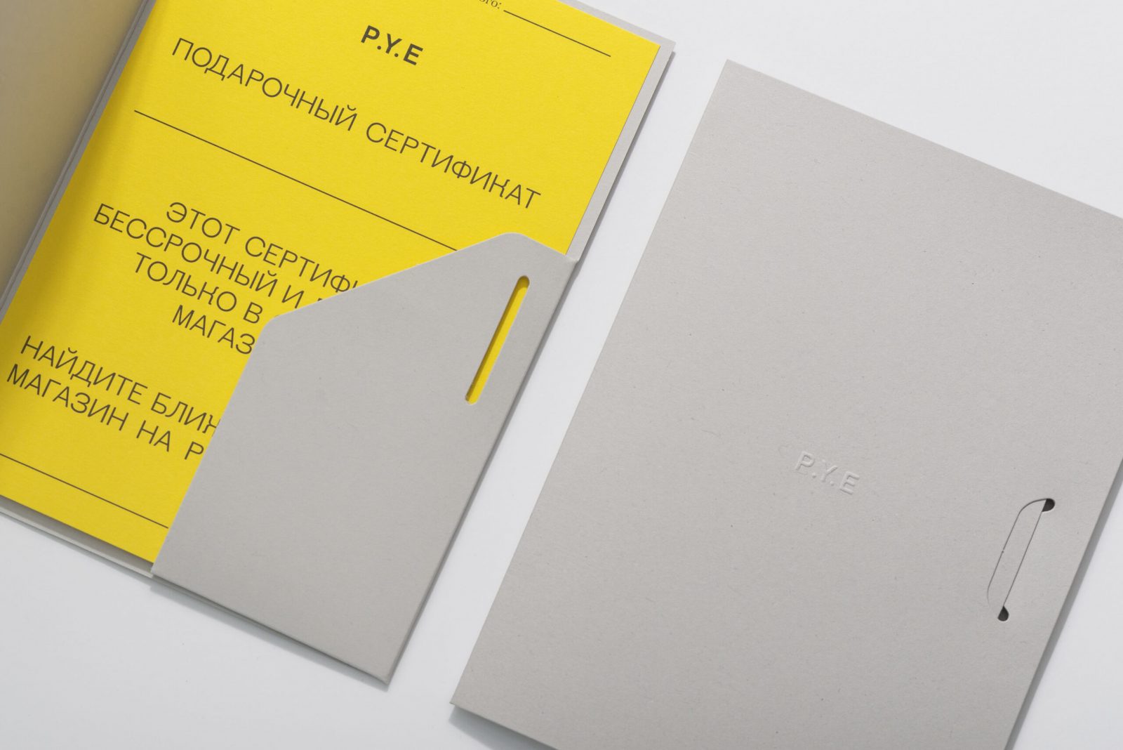 Подарочный сертификат и папка для магазина PYE OPTICS. Индивидуальная форма папки с замком, конгревное тиснение логотипа.